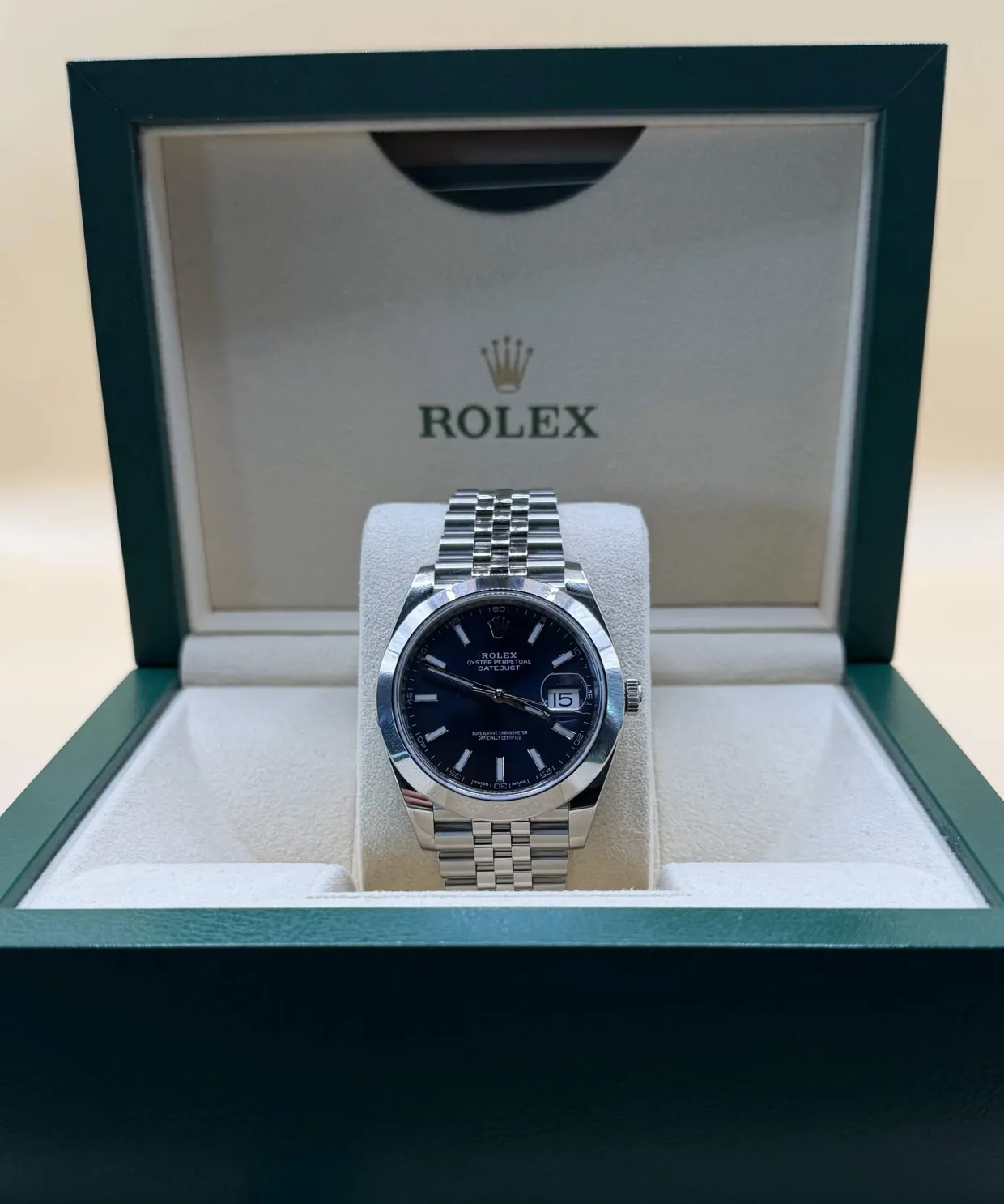 Denne Rolex Datejust 41 Blue Dial Jubilee 126300 er et klassisk eksempel på Rolex’ tidløse design kombineret med moderne elegance. Uret fremstår med en markant blå skive, som skifter nuance afhængigt af lyset, og giver et eksklusivt og sofistikeret udtryk.